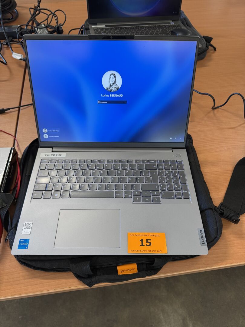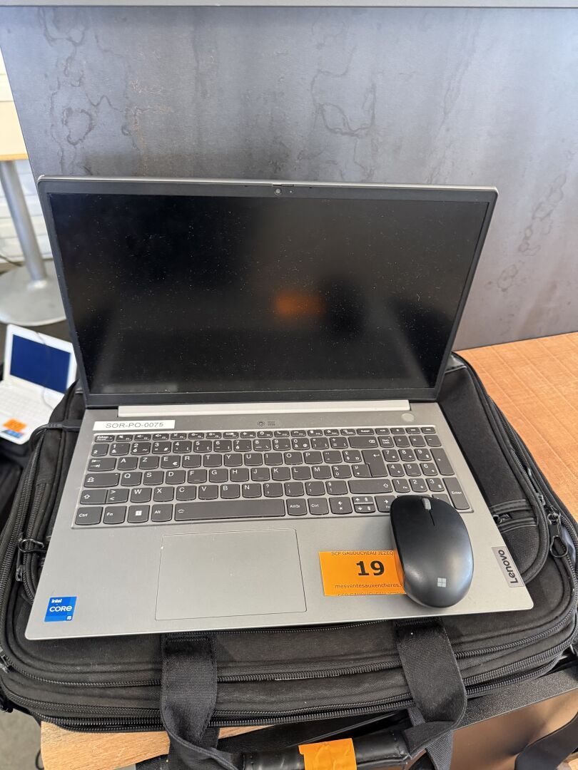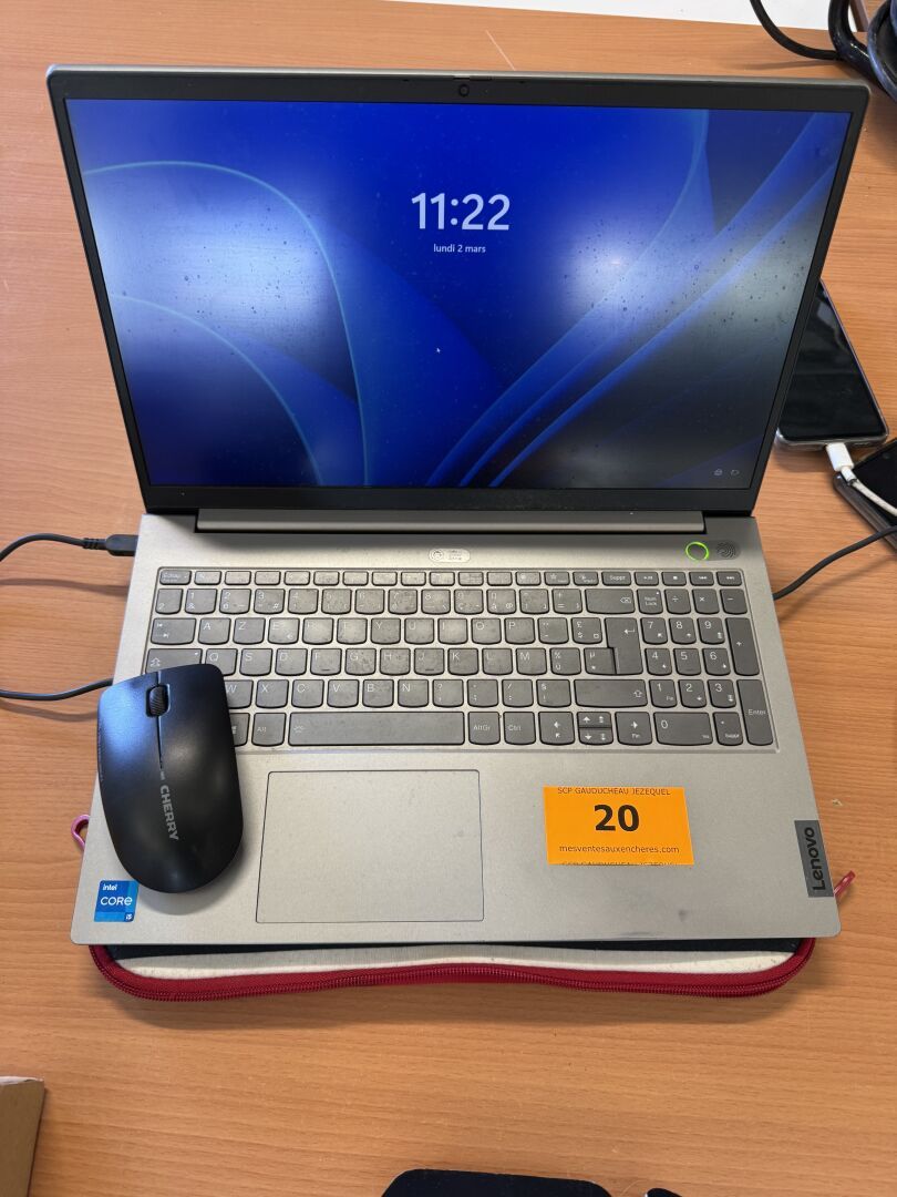 PC portable LENOVO ThinkBook, n° série donné à titre indicatif : MP2C1A0Q, core i5, 2022 (s'allume, non réinitialisé, mot de passe inconnu), chargeur, sacoche, souris sans fil (sans plug)
