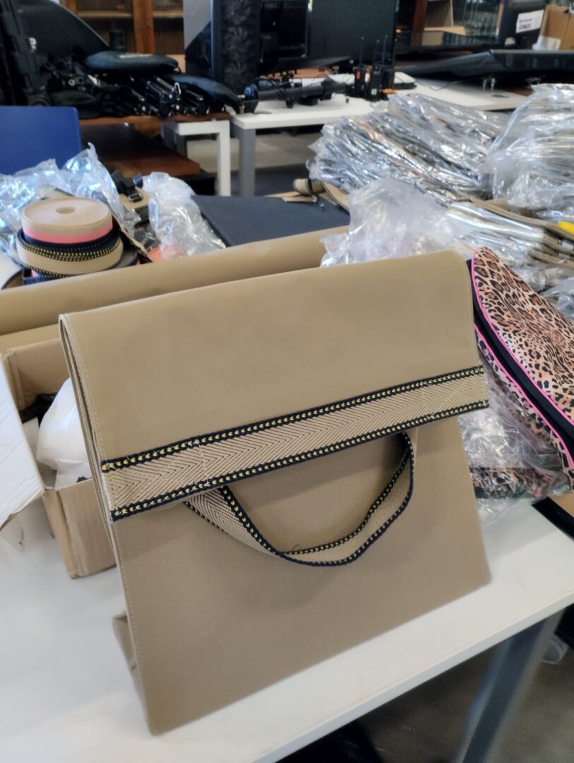 + 2 rouleaux entamés de toile beige, rouleaux de ruban, systèmes d'accroche en métal