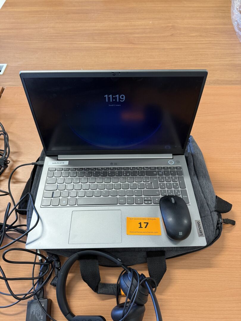 PC LENOVO Thinkbook, n° série donné à titre indicatif : NP2C200T, 08/2022 (s'allume, non réinitialisé, mot de passe inconnu), sacoche, chargeur, casque micro, souris sans fil